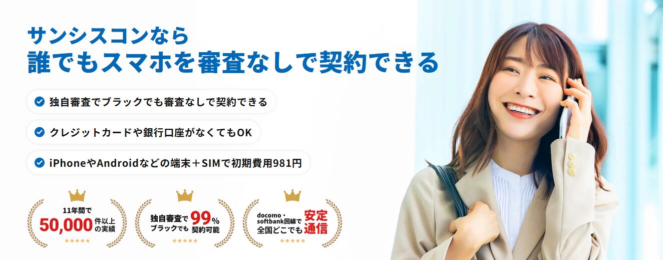 サンシスコンは、「クレジットカード・銀行口座がなくてもスマホを持てる」「携帯ブラック・金融ブラックでも契約可能」といった特徴を前面に打ち出すレンタル携帯・格安SIMサービスです。特に「既存の携帯キャリア審査で断られた」「支払い実績に不安がある」といった方にも門戸を広げており、通常のキャリアでは契約が難しい状況にある人たちにとって頼れる選択肢となっています。